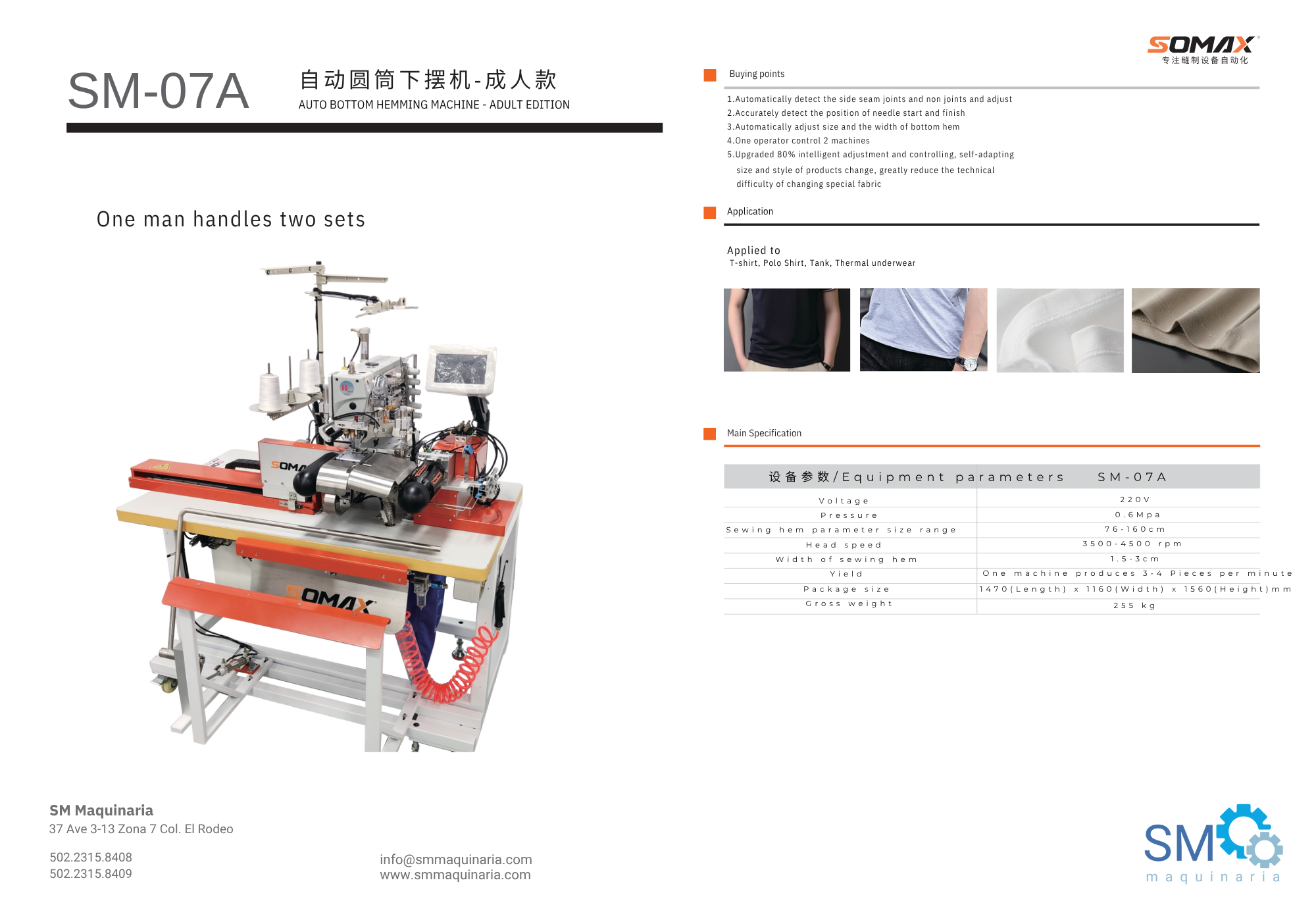 The SM-07A Automatically detects the side seam joints and non joints and adjust. Accurately detect the position of needle start and finish. Automatically adjust size and the width of bottom hem. One operator control 2 machines. Upgraded 80% intelligent adjustment and controlling, self-adapting size and style of products change, greatly reduce the technical difficulty of changing special fabric.