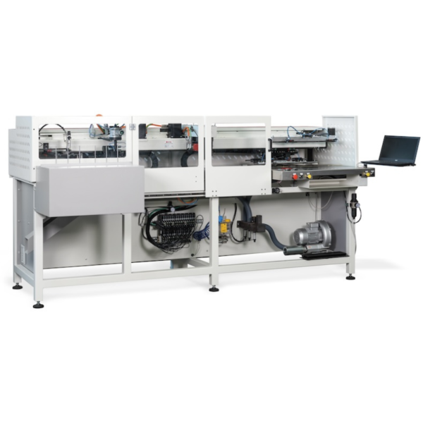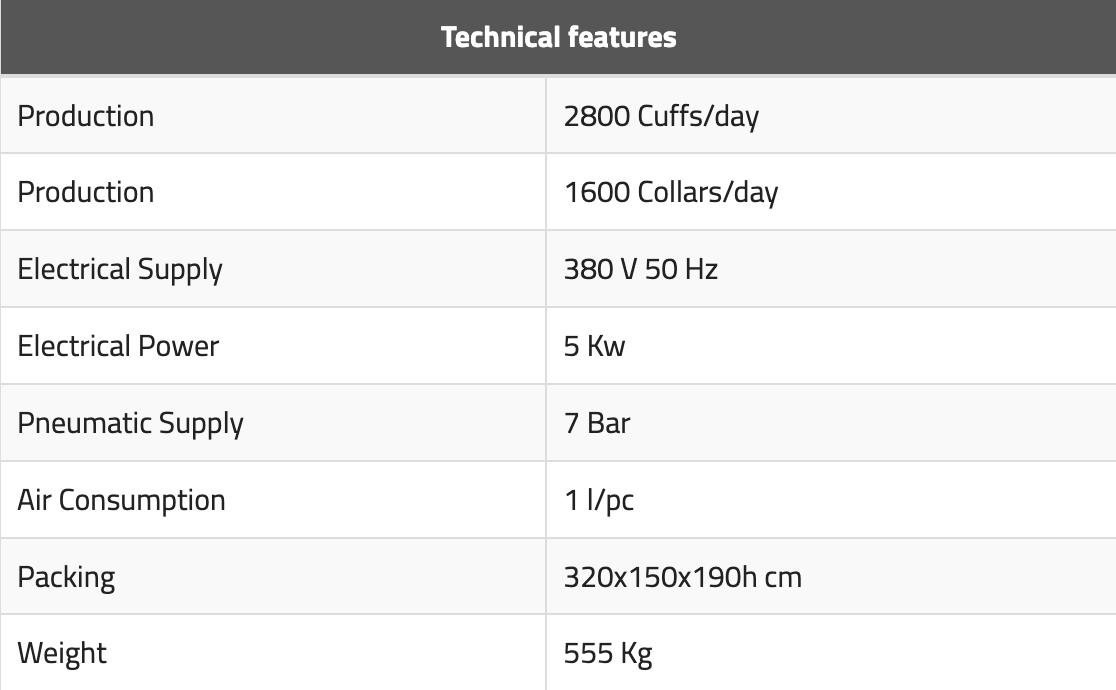 La longitud del puño se puede ajustar utilizando las mismas plantillas, pero si se cambian las anchuras, será necesario usar una nueva plantilla. La anchura puede variar de 15 mm a 30 mm. Dos apiladores siguen el proceso y trasladan las piezas terminadas a la parte posterior de la unidad. Todo se controla mediante computadora, por lo que el operador solo necesita alimentar la máquina. Esta opción permite actuar directamente desde Italia si se detecta un problema, utilizando solo Wi-Fi.