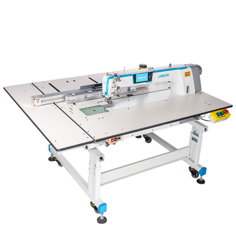 Máquina de campo de patrón con cama plana, un nuevo concepto de máquina de campo de patrón con un espacio de trabajo que se puede reducir gracias a la mesa plegable. El panel táctil ha sido completamente rediseñado con WIFI integrado. La carga de las plantillas es rápida y sencilla gracias a la lectura RFID del programa. Doble movimiento de la cuchilla del cortador de hilo para cortar el hilo corto a 4 mm. El espacio es compacto: 1200 mm x 1535 mm (1300 mm después de plegar), y las dos áreas de costura pueden cambiarse libremente: solo hay que mover el haz de luz hacia la izquierda o derecha según la marca del rango, permitiendo cambiar entre las dos áreas de costura. Al cambiar a coser una área más pequeña, se puede bajar la mesa plegable para ahorrar espacio. El cabezal hereda el diseño de otras máquinas Jack, con un estilo industrial alemán, excelente manufactura, atención especial a los detalles, y un diseño simple pero elegante. El cabezal está rodeado por tres piezas de marco y la máquina en su conjunto tiene una estética muy bonita. La máquina está completamente integrada y conectada perfectamente a la superficie que la rodea. El panel es innovador e intuitivo, equipado con tres botones de color para gestionar las operaciones en la pantalla, el paro de emergencia, la presión sobre el marco y los diseños de costura.