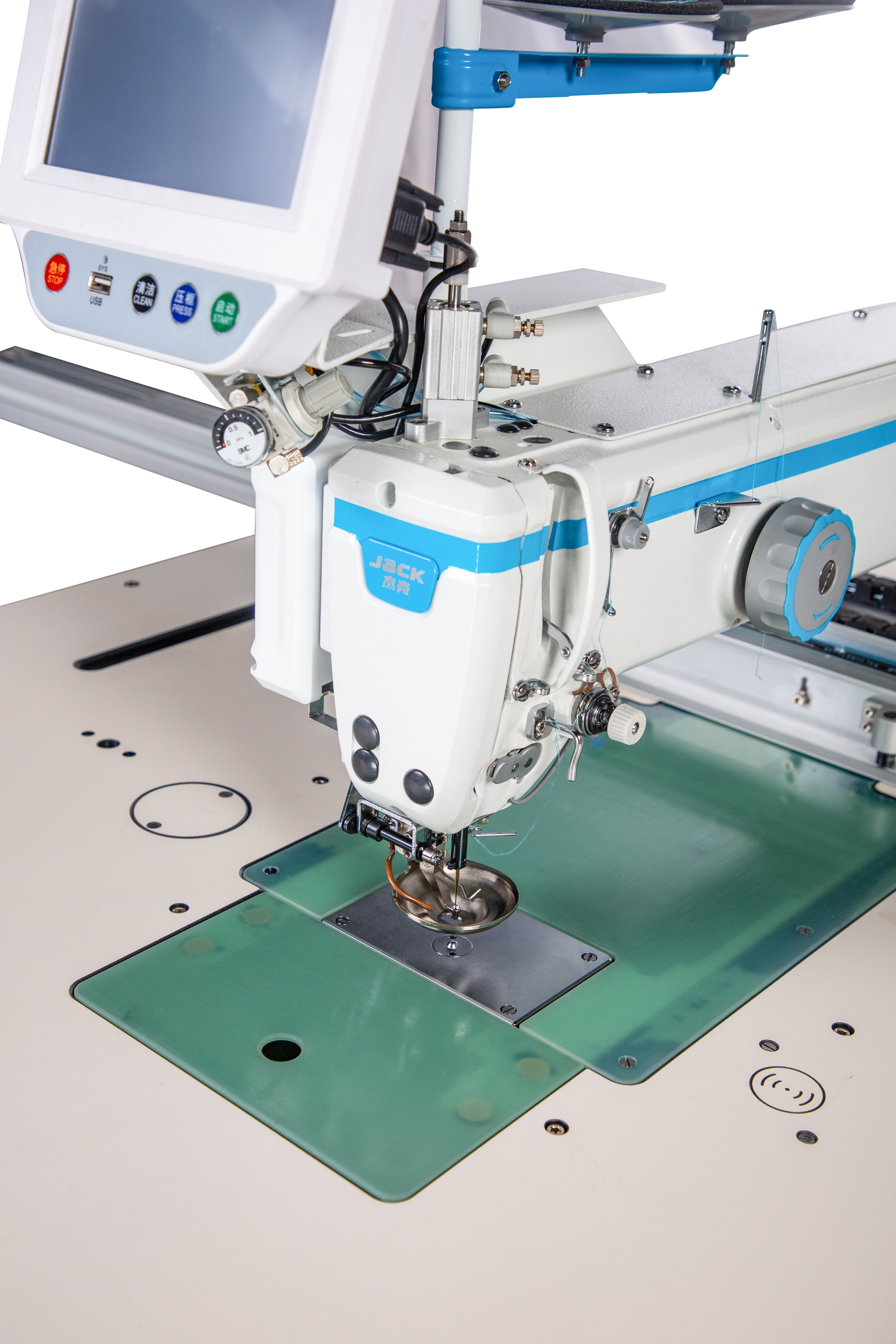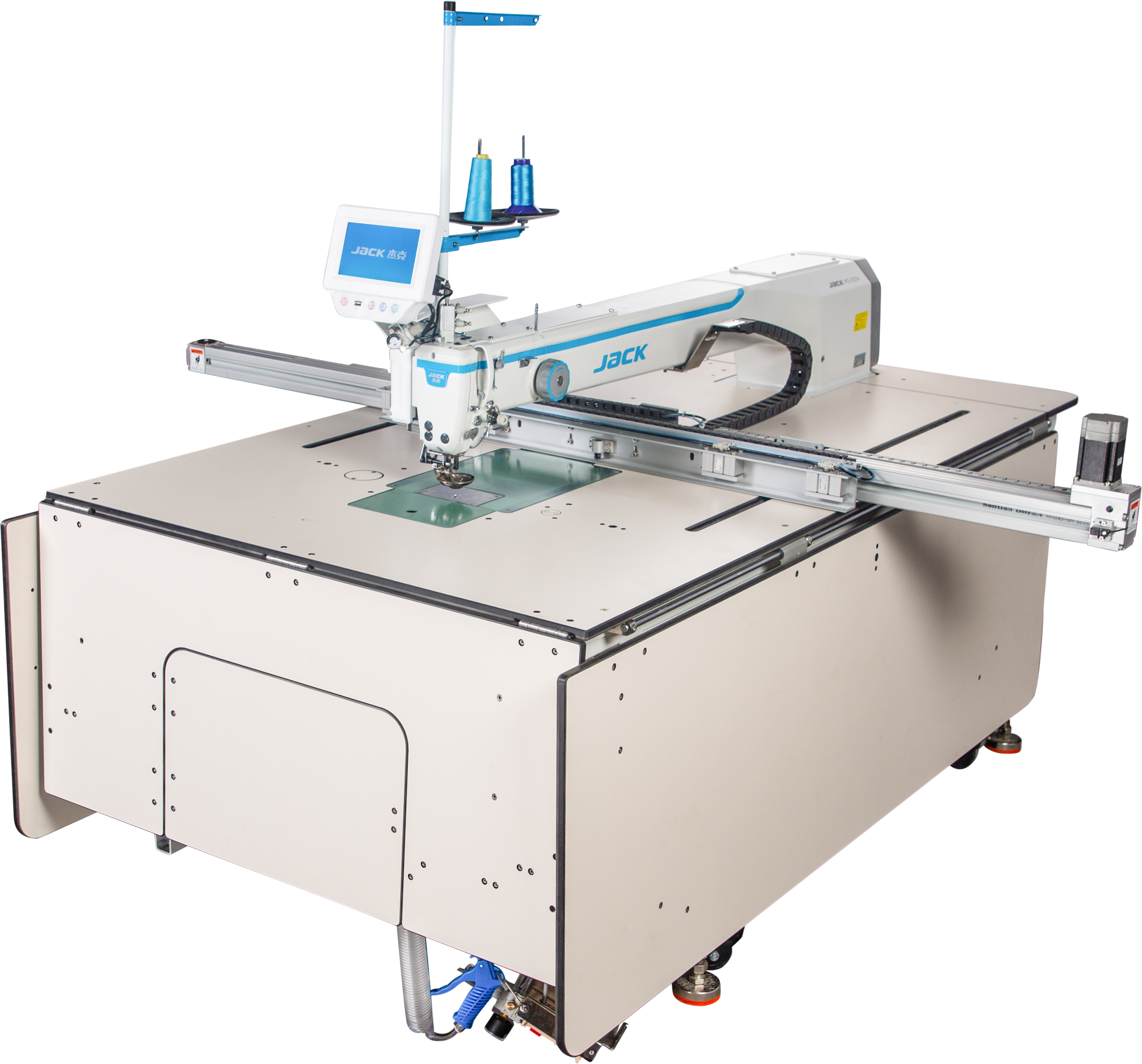 Cambio automático de bobina, corte láser que sigue la costura, elevación precisa de la bobina para evitar coser en vacío. Además, cuenta con una muesca para marcar puntos precisos donde colocar los bolsillos.