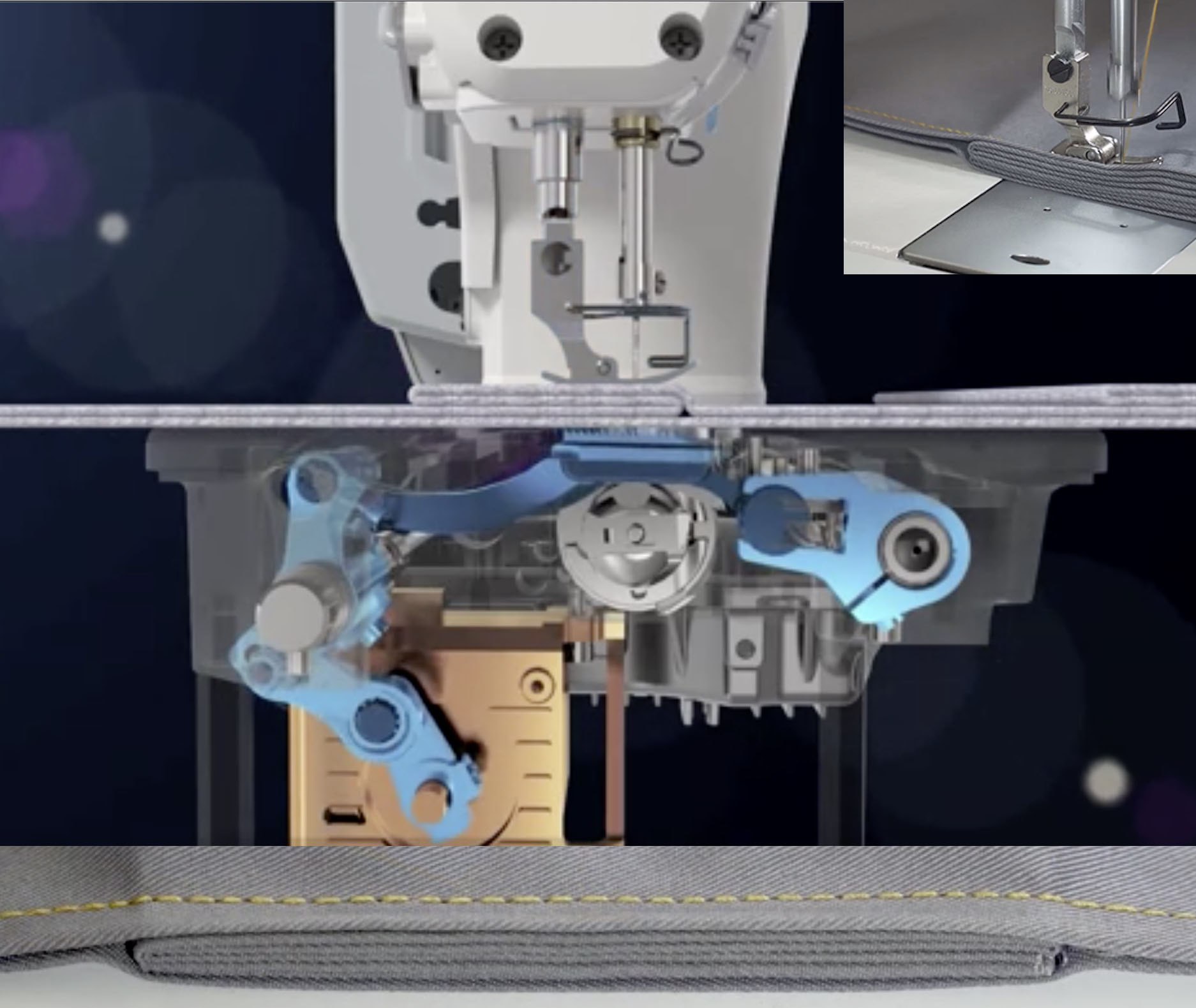 Puntada de bloqueo con movimiento digital del transporte, detección de grosor de tela, ajuste digital de puntadas, bartack digital silencioso y patrones de puntadas. Abre-disco de tensión eléctrica, enrollador de canillas con corte automático, compás de barra de aguja alargada. Cortador automático de hilo, elevador de pie prensatela, bartack digital y recorte de hilo corto. Cubeta de aceite sellada y brazo de 260 mm.