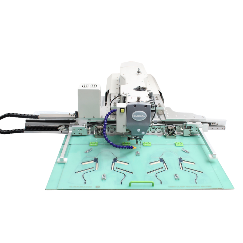 Los patrones se programan en el panel táctil fácil de usar. La pinza izquierda y derecha se pueden programar para moverse de manera independiente. La máquina se entrega completa con mesa, soporte y un mini servomotor de accionamiento directo.