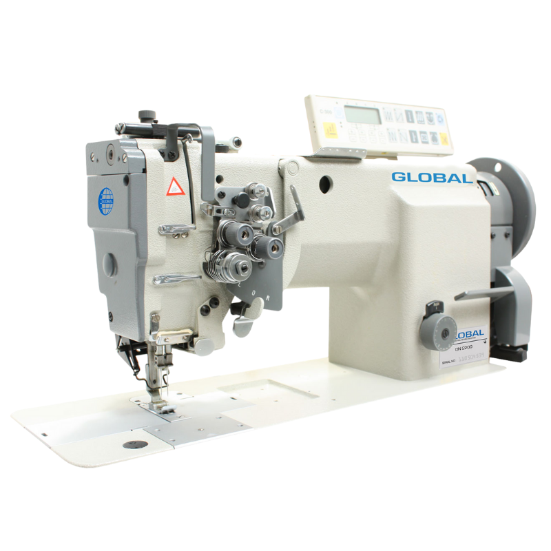 Máquina de coser de doble aguja con alimentación de aguja y de caída. La máquina está equipada con cortador de hilo debajo de la cama y retroceso automático (eléctrico). La máquina viene de serie con ganchos de eje vertical.