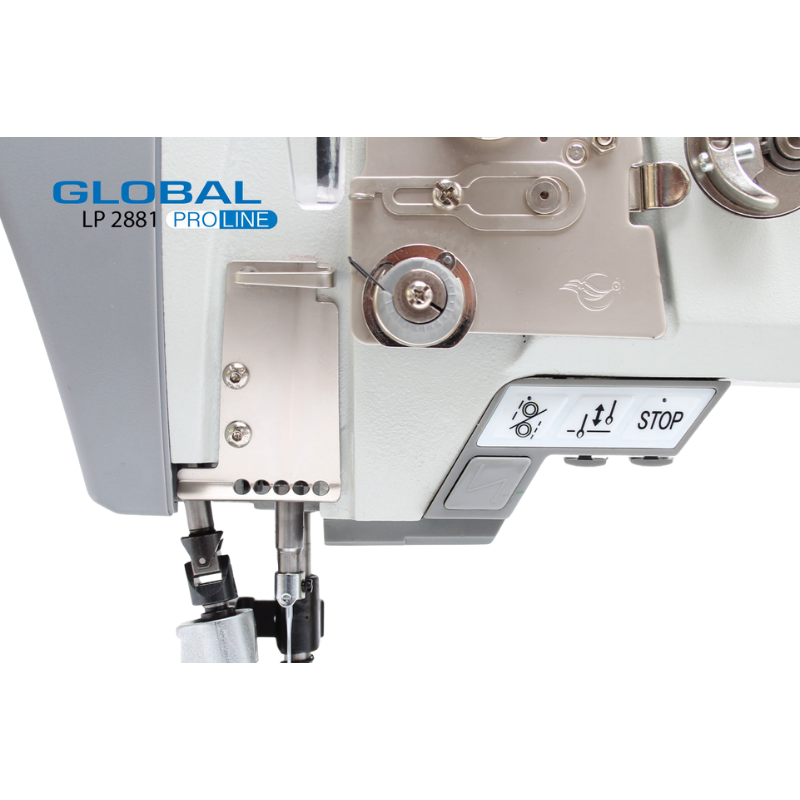 Máquina electrónica de poste, de una aguja, con gancho estándar, prensatelas con avance por rodillo, y alimentación por rueda y aguja. La máquina está equipada con cortador de hilos eléctrico, elevación del prensatelas y retroceso automático.